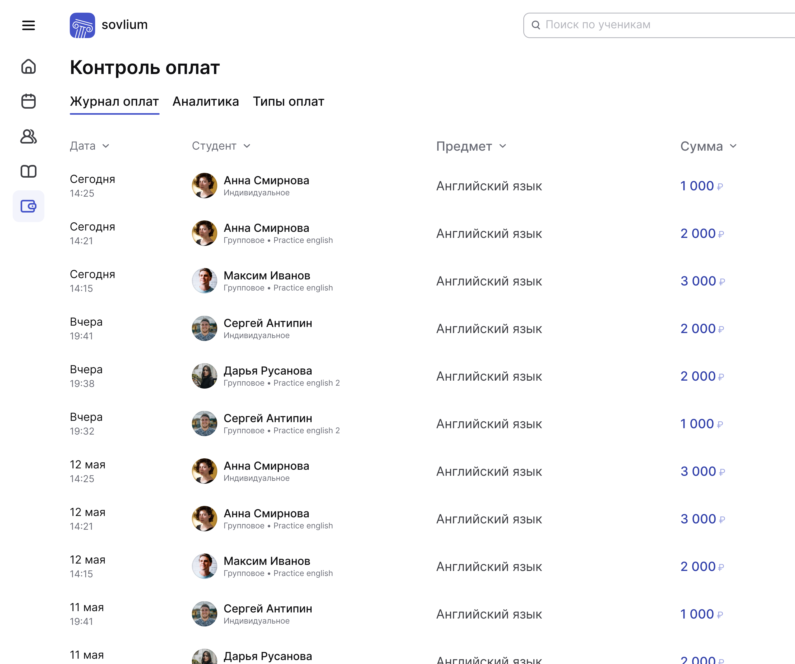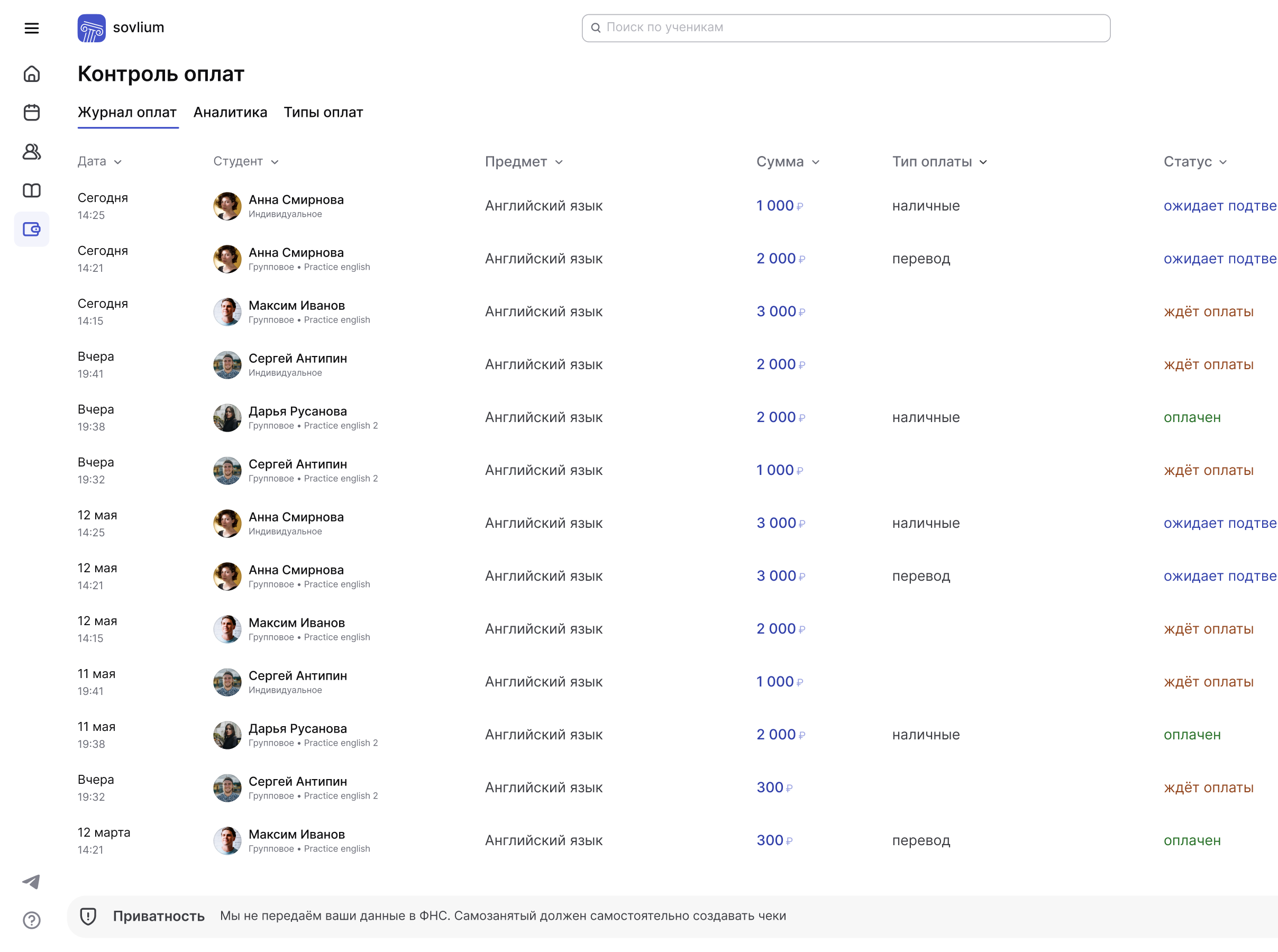 Отправляйте счета на оплату и подтверждайте получение денег. Если оплата задержится, мы сами пришлём ученику напоминание